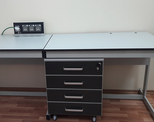 Тумба лабораторная, подкатная, размером 120 × 50 × 76 см, с 4-мя ящиками, с 4 колесиками (2 колесика имеют блокировку). Ящики с системой self closing – мягкое закрытие. Тумба имеет систему от опрокидывания. Центральный замок.