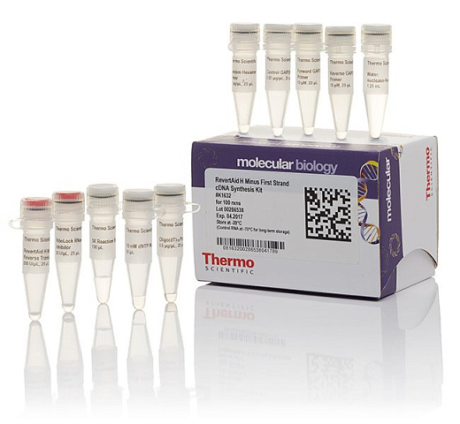 Набор с обратной транскриптазой RevertAid - полная система для эффективного синтеза первой цепи кДНК ан РНК-матрицах. В состав набора входит обратная рестриктаза RevertAid - рекомбинантная обратная транскриптаза вируса лейкемии мышей (M-MuLV-RT). Она активна при температурах от +42 до +50оС и способна синтезировать кДНК до 13 тыс. п.н.