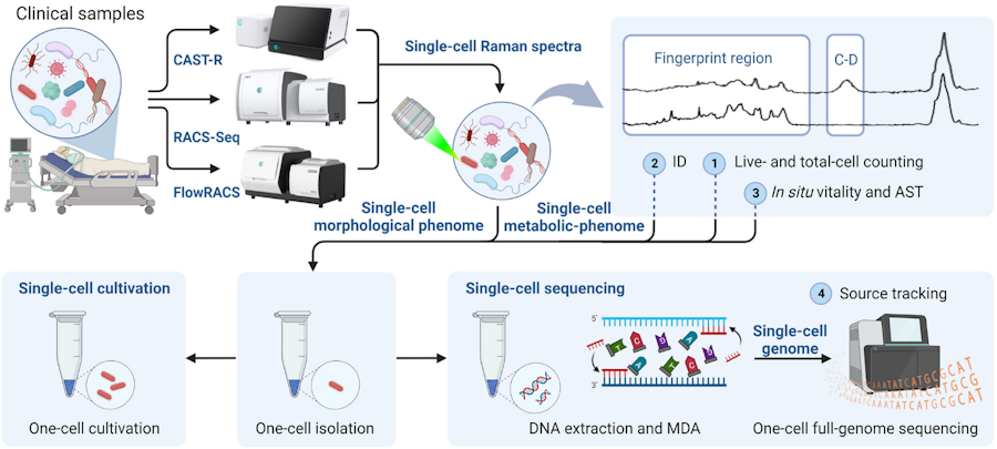 Таким образом, изучая Раман-спектр единичных клеток мы получаем, с одной стороны, информацию о характеристике фенотипа единичной клетки, о наличии тех или иных соединений в клетке (например наличие факторов антибиотикорезистентности бактерий или редких ферментов), и, с другой стороны, сложив данные о всех клетках, мы можем получить рамано́м данной популяции клеток, оценить гетерогенность данного пула клеток и выделить субпопуляции клеток.