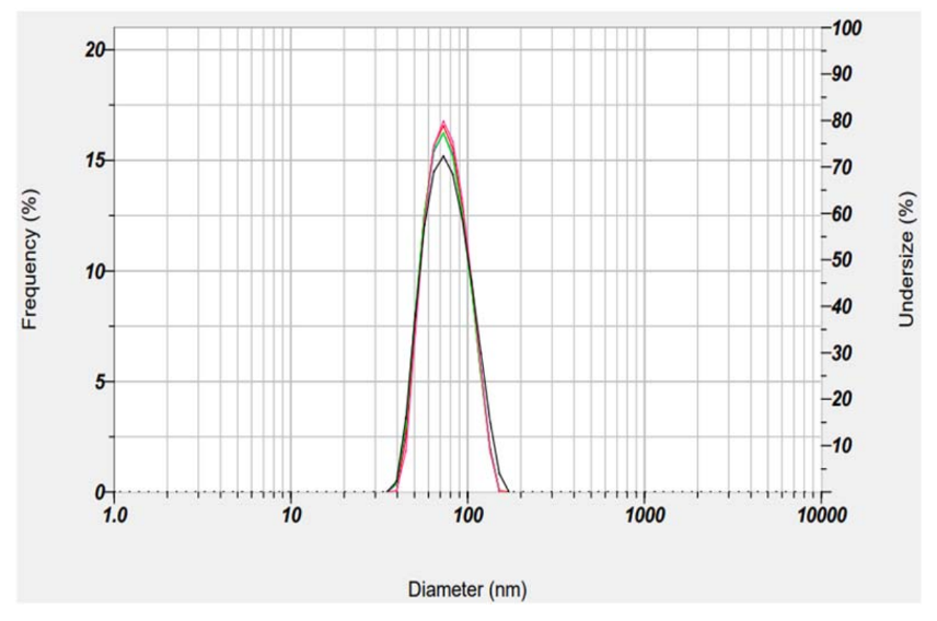 Средний диаметр 67,3 нм. PDI составляет 0,106. Эффективность инкапсуляции составляет 94,5% (набор для количественного определения РНК Ribo Green).