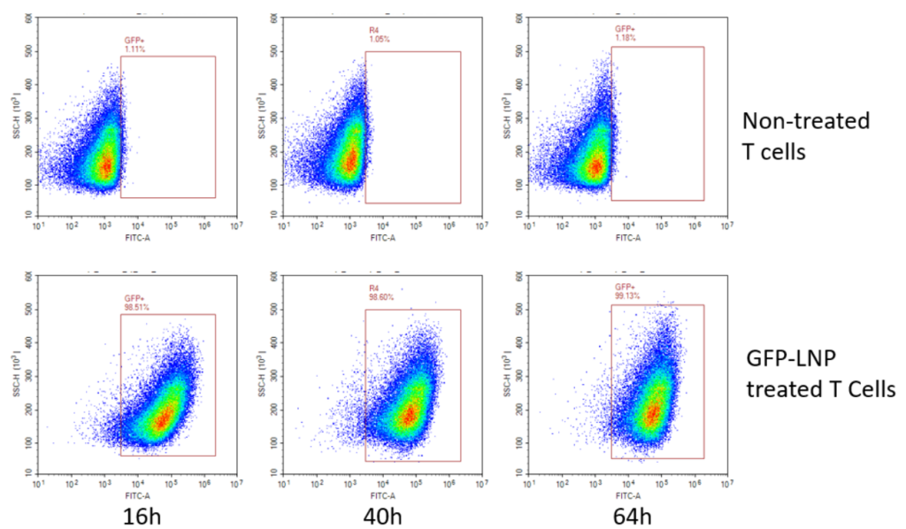 Рисунок 3. GFP(+) положительная популяция контрольных (без лечения) и первичных Т-клеток, обработанных eGFP LNP, через 16, 40 и 64 часа. Для распознавания мертвых клеток использовался краситель 7-AAD. Гейтирование: выделяем область синглетов, исключая дублеты. Затем – популяцию здоровых клеток. Наконец, гейтируем жизнеспособные клетки, неокрашенные красителем 7-AAD, и GFP+ клетки по каналу FITC.