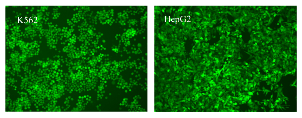 Рисунок 2. Экспрессия GFP в клеточных линиях K562 (слева) и HepG2 (справа) через 48 часов после обработки GFP-LNP, синтезированным с помощью NanoGenerator Flex-S.